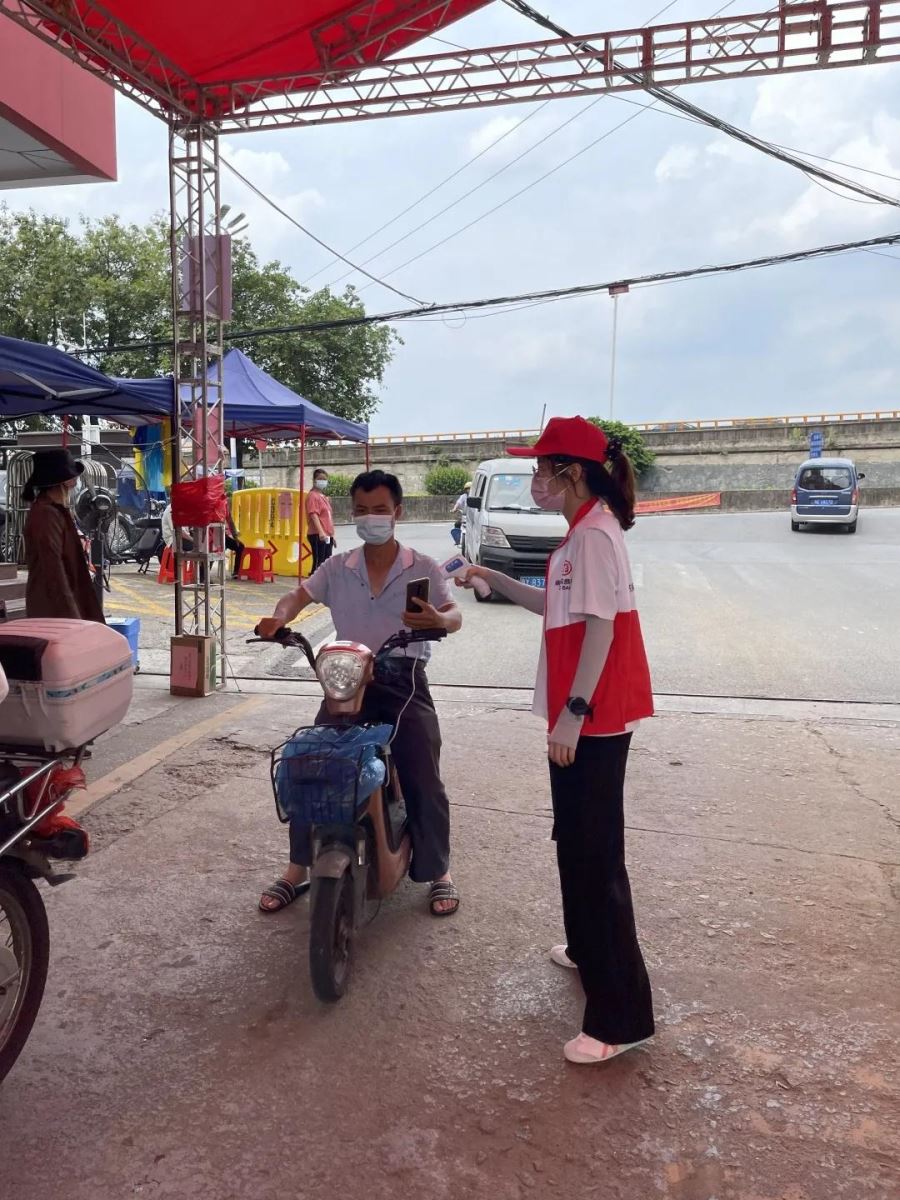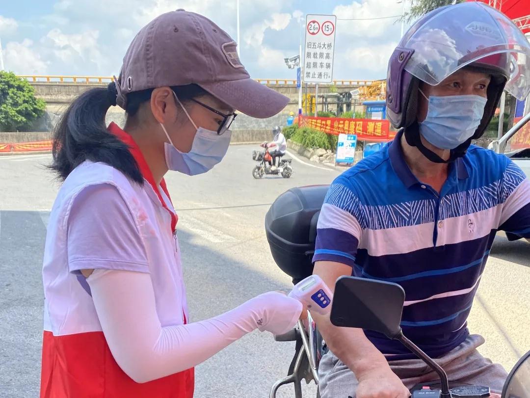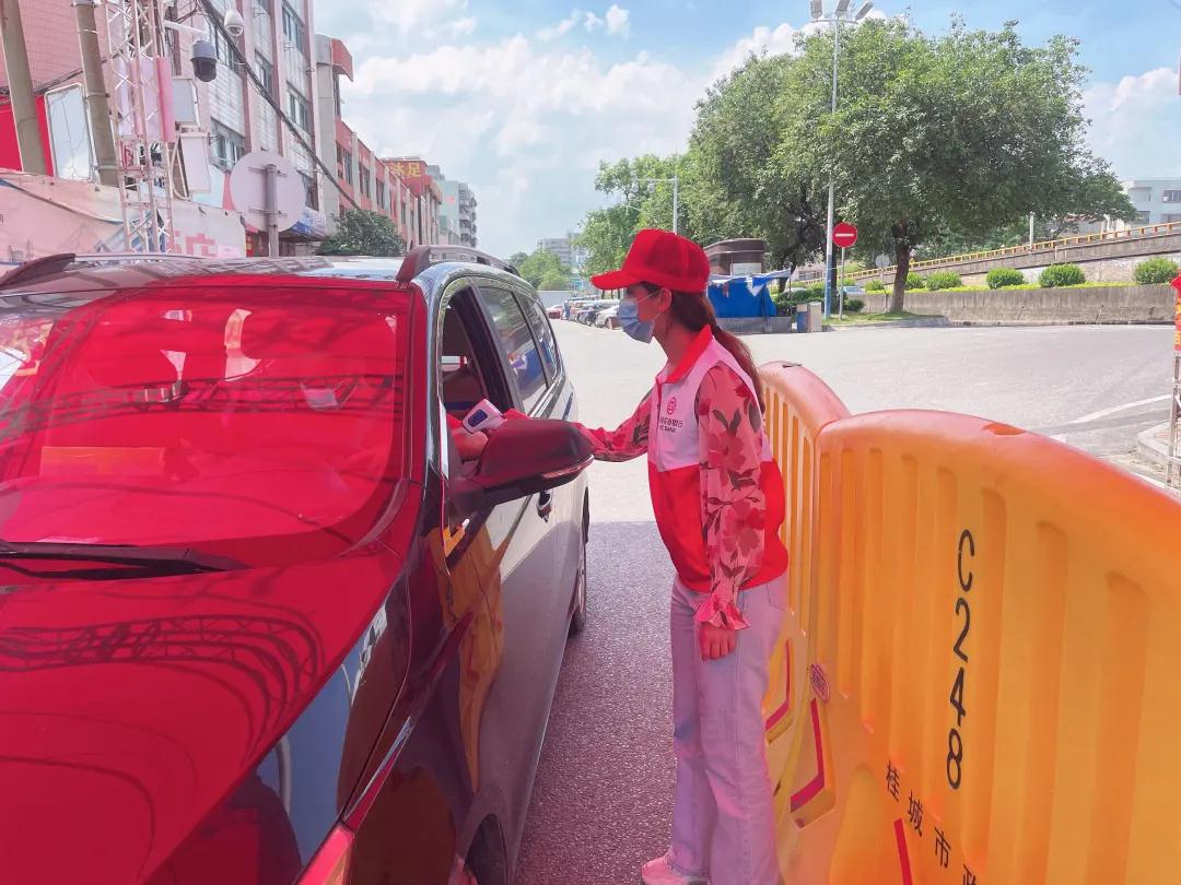 下午的太阳辐射越来越热,电风扇吹出的都是热风,志愿者们的上衣早就湿透,拿着测温枪的手也都出了汗。然而,三十多度的高温挡不住志愿者的热情,宽大的口罩遮不住志愿者的笑容。