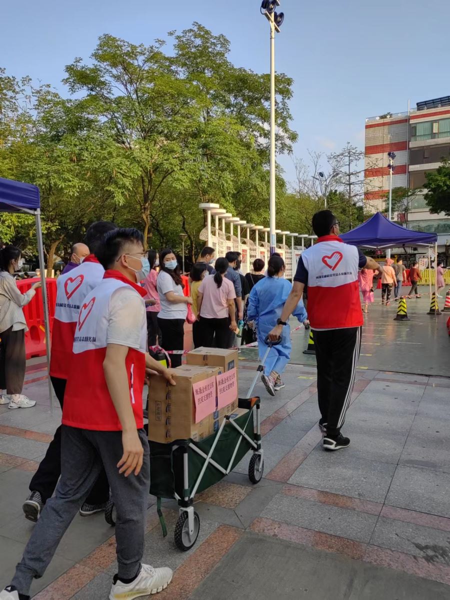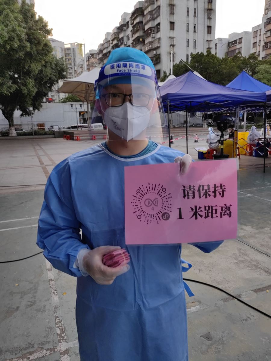 志愿服务期间,志愿者们穿上浅蓝防疫服,头戴医用隔离面罩和口罩,在等待做核酸检测的人群中维持秩序,引导群众有序排队,提前准备好粤康码、行程卡和粤核酸码。