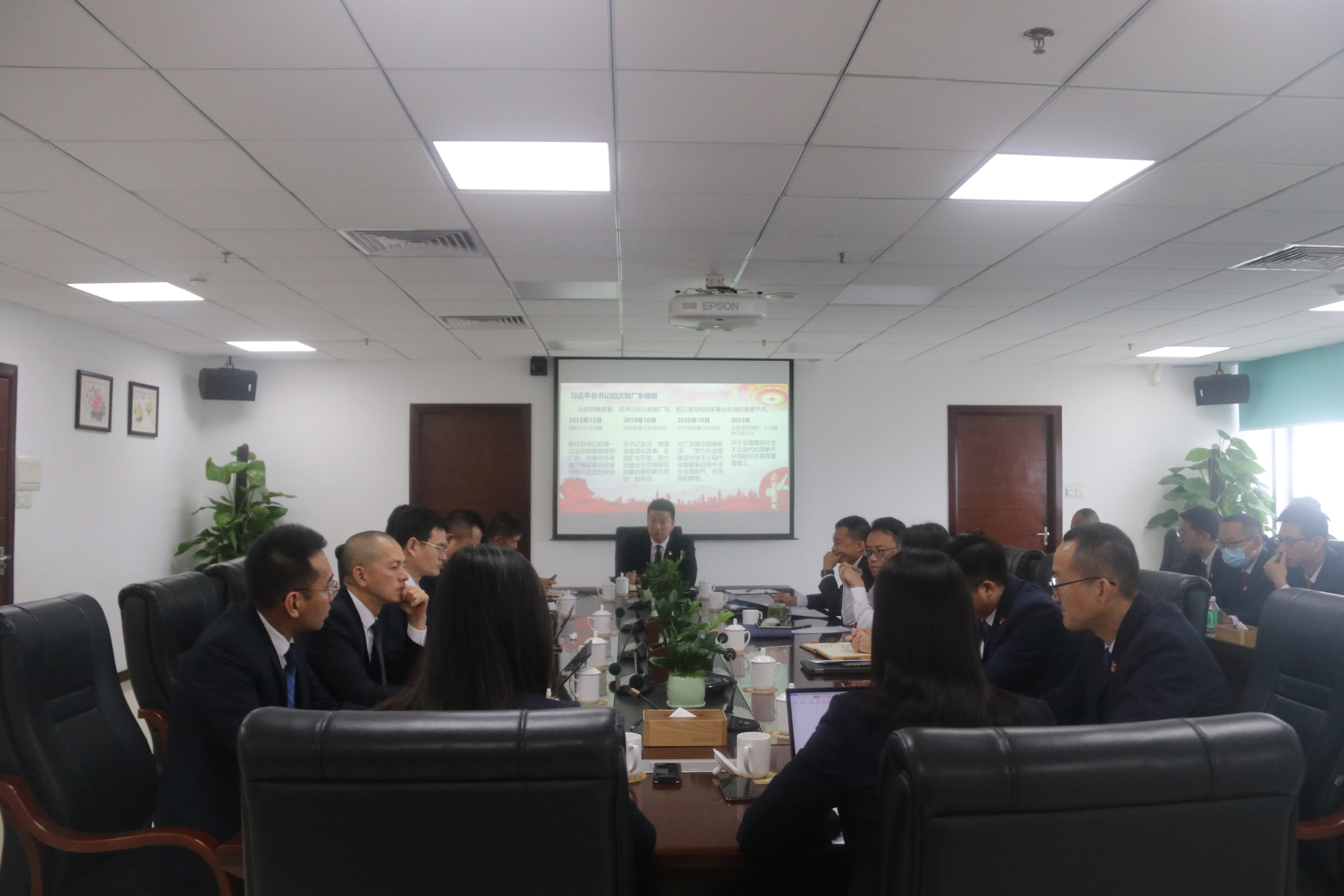 与会人员首先观看学习了习近平总书记本次视察广东的纪实短片,对总书记视察的行程及调研内容有了更深的了解。接着,党支部书记曾剑涛同志从时间维度和空间维度解读了总书记自党的十八大以来四次视察广东背后蕴含的深意,并带领众人深入学习了总书记本次视察广东的重要讲话内容。