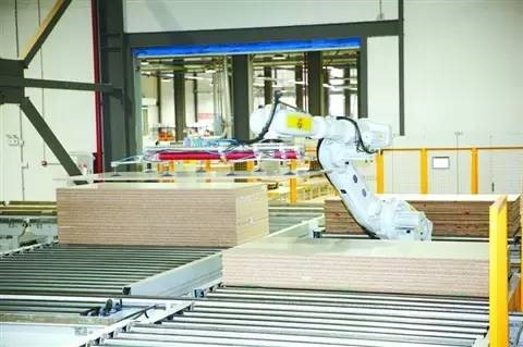 在维尚家具刚启用不久的第五分厂内,机械智能手臂正在工作
