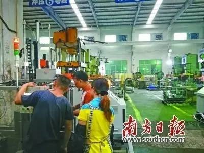 阳晨厨具车间内,工人正在对一条冲压自动生产线进行调试
