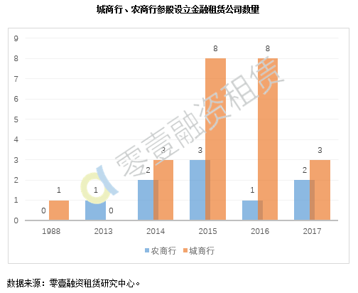 2014年以来,城商行、农商行迅速涌入金融租赁行业。截至2017年6月底,共有23家城商行参与设立金融租赁公司,9家农商行参与设立金融租赁公司。