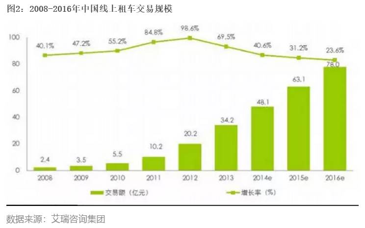 2013年中国在线租车市场交易规模超过34亿,同比增长接近70%,预计未来四年线上交易规模增速均高于20%。