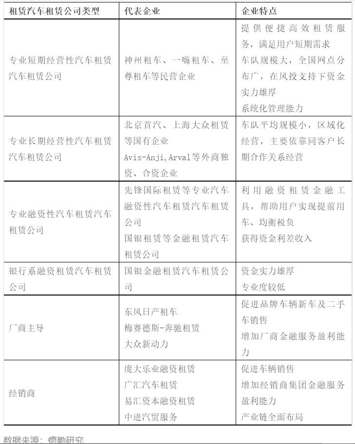 在汽车市场增速回归正常、新车销售利润下滑的趋势下,融资租赁可以有效降低消费者购车门槛,从而促进新车销售并随之带来后续售后市场服务,并成为新的盈利增长点,而这点也深受企业用户欢迎。经营性汽车租赁也可以有效实现批量销售。因此,不仅仅是专业汽车租赁汽车租赁公司,厂商及经销商都在积极投身汽车租赁这片蓝海中。租赁汽车租赁公司分类见下表: