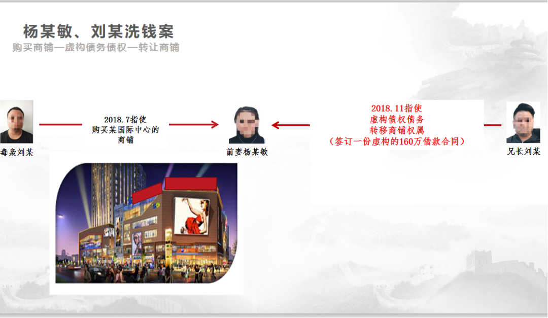 2018年,广州警方联合广西南宁、钦州,云南保山、德宏等地禁毒部门侦破一宗毒品案件,缴获海洛因81公斤,该案是近三年来广州市单案缴获海洛因最多的案件,然而毒枭刘某名下个人财产几乎为零,明显不符合常理。经警方调查后发现,毒枭刘某前妻杨某敏名下拥有一套价值超459万元的别墅和200余万元的现金存款,其兄长刘某亦在短时间内先后开办了镇上最大的超市、火锅店,还拥有一套价值200万元的商铺,有关异常情况引起了广州禁毒部门的关注。经分析研判,发现毒枭刘某的前妻杨某敏和其兄弟刘某有掩饰、隐瞒毒资的重大嫌疑,后抓获涉嫌洗钱罪的犯罪嫌疑人刘某和杨某敏,查封扣押涉案资金、不动产和车辆折合人民币约800万元。洗钱手法如下: