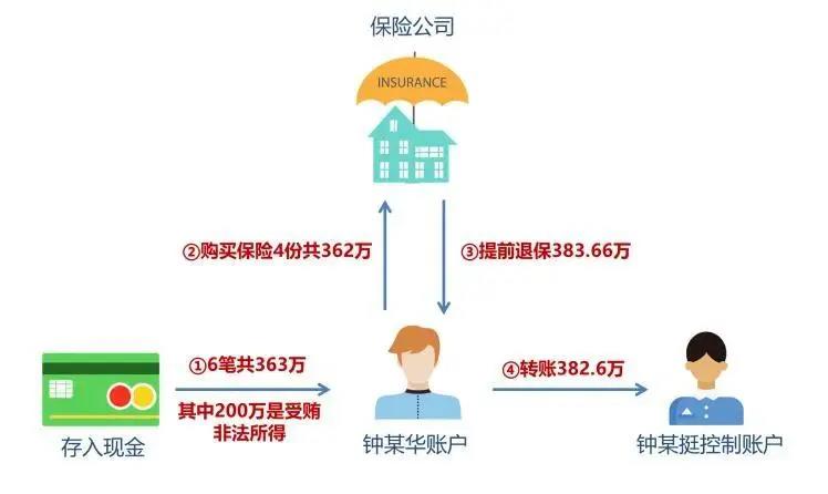 以趸交方式集中购买大额分红型保险产品并提前退保。惠州钟某华在钟某挺指使下,2013年用存入自己银行卡的大额受贿资金分别在3家保险机构购买了5份以钟某华为被保险人的保险,累计缴纳保费为362.08万元,并交由钟某挺持有并保管;其中4份分红型保险产品(金额分别为100万、100万、100万、62万)通过银行代理以趸交方式购买,均在2016年3月22日提前退保,退保金额3836582.68元退回原缴费账户(钟某华账户),2016年3月27日钟某华将部分退保资金382.6万元转到钟某挺控制账户(钟某挺妻子账户)。