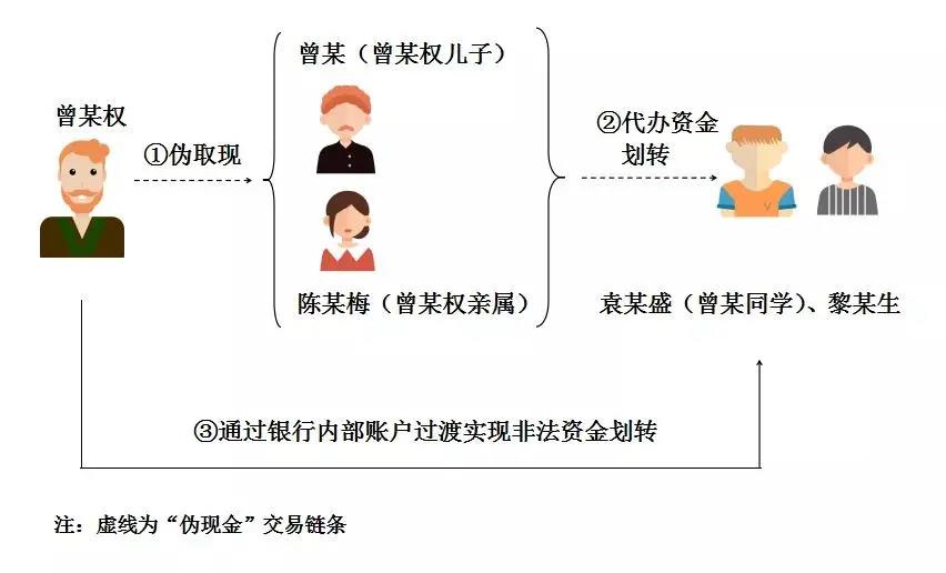 (一)以“伪现金”方式通过他人账户转移藏匿非法收益。在茂名袁某盛、黎某生洗钱案中,曾某权通过借助上述两人的资金账户,以“伪现金”(指未发生真实现金存取,而是商业银行通过利用现金业务方式(如内部账户过渡)和渠道为客户提供资金划转和转账服务,实现资金在不同客户账户间流动的交易)方式人为切断资金交易链条,并借助多次大额“存取现”的方式将违法所得进行转移藏匿。