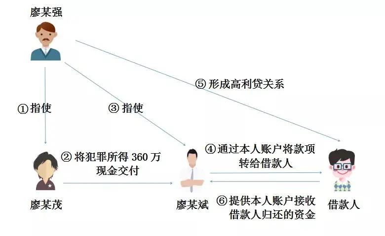 (三)通过放贷方式掩饰、隐瞒犯罪所得。在江门廖某斌洗钱案中,犯罪团伙成员廖某茂受廖某强的指使,将犯罪团伙非法转卖某某村留用地土地使用权的部分所得共360万元以现金方式交给廖某斌,廖某斌将上述现金存入其本人名下的中国银行账户,并在廖某强的授意下通过该银行账户将非法资金用于发放高利贷,并收取利息,进一步掩饰、隐瞒资金真实来源。
