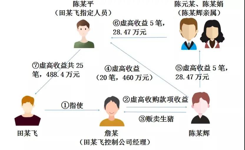 (四)提供资金账户转移违法所得。在茂名陈某辉、梁某耿、陈某熹洗钱案中,田某飞授意其司机梁某耿开设银行账户,并将该账户绑定田某飞的手机号码,在公司财务林某文、公司经理詹某的协助下,将143.7万元以转账方式分3笔从公司账户转至梁某耿账户;陈某辉作为当地生猪供应商,在田某飞的授意下,串通公司经理詹某虚高生猪收购价格,并提供本人账户及利用其堂哥陈元某和大姐陈某娟两人账户将虚高价格的非法收益488.47万元以转账方式分25笔转移至田某飞指定的陈某平账户中;田某飞司机陈某熹在其授意下,通过现金及转账方式,利用本人名下账户为田某飞转移非法资金,累计转移违法所得166.7万元。