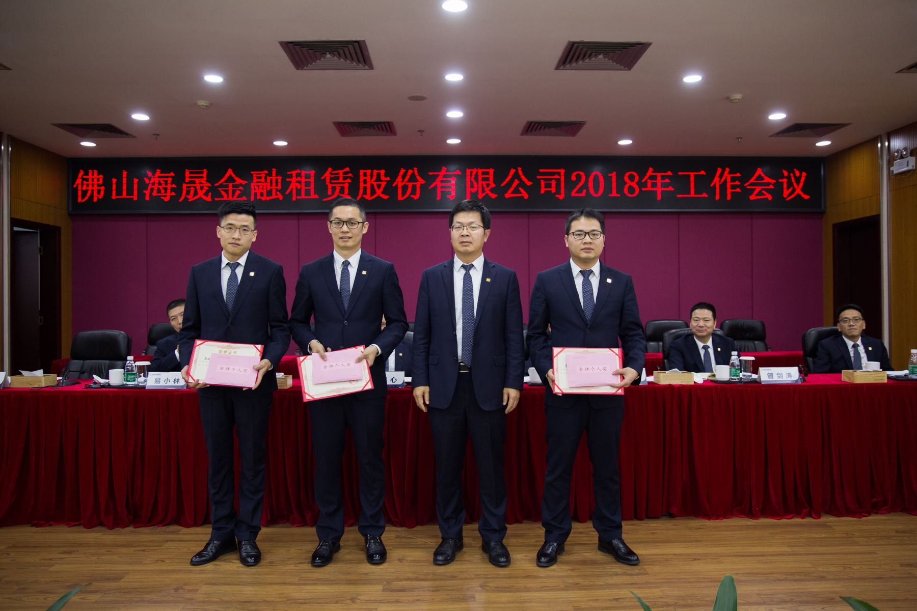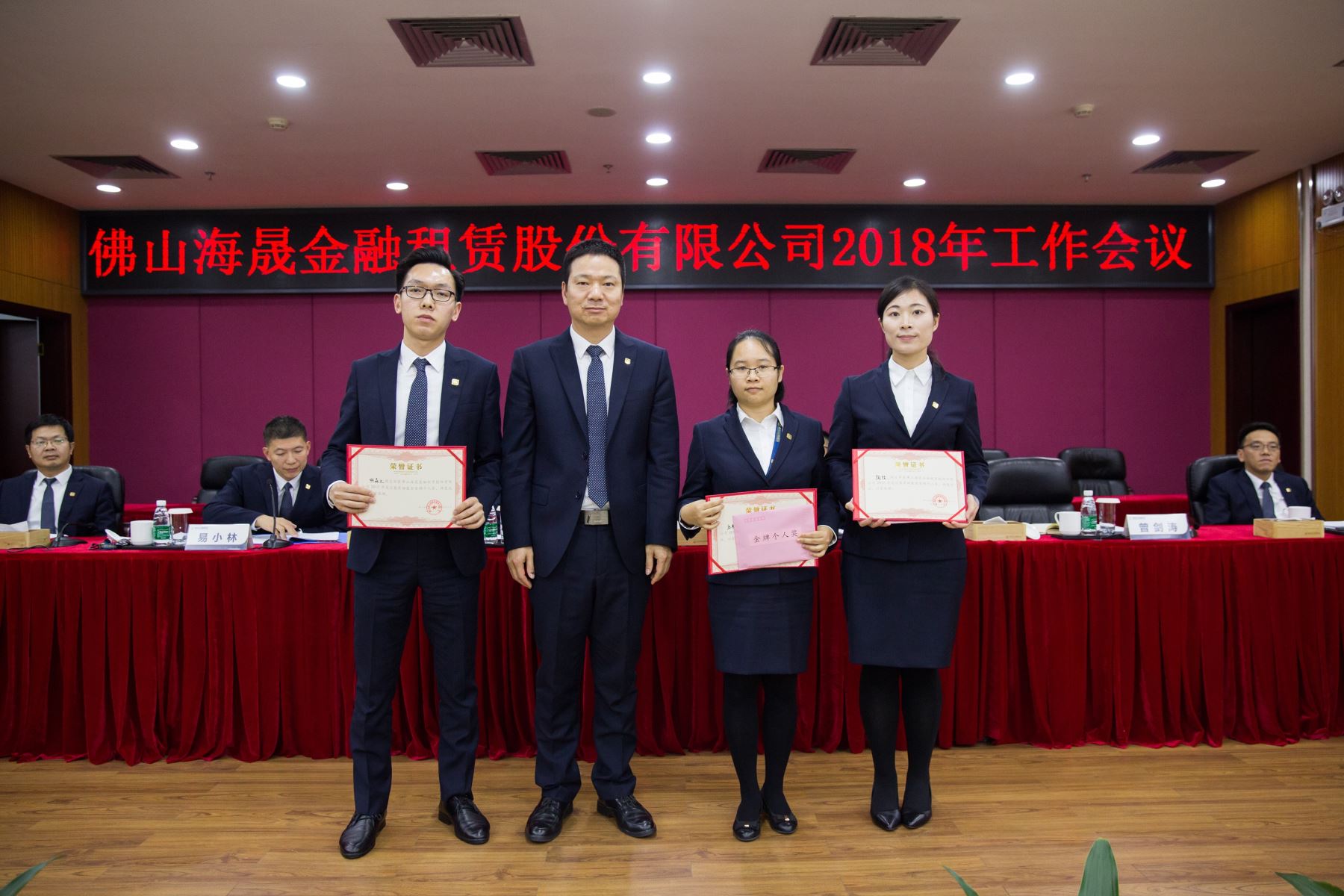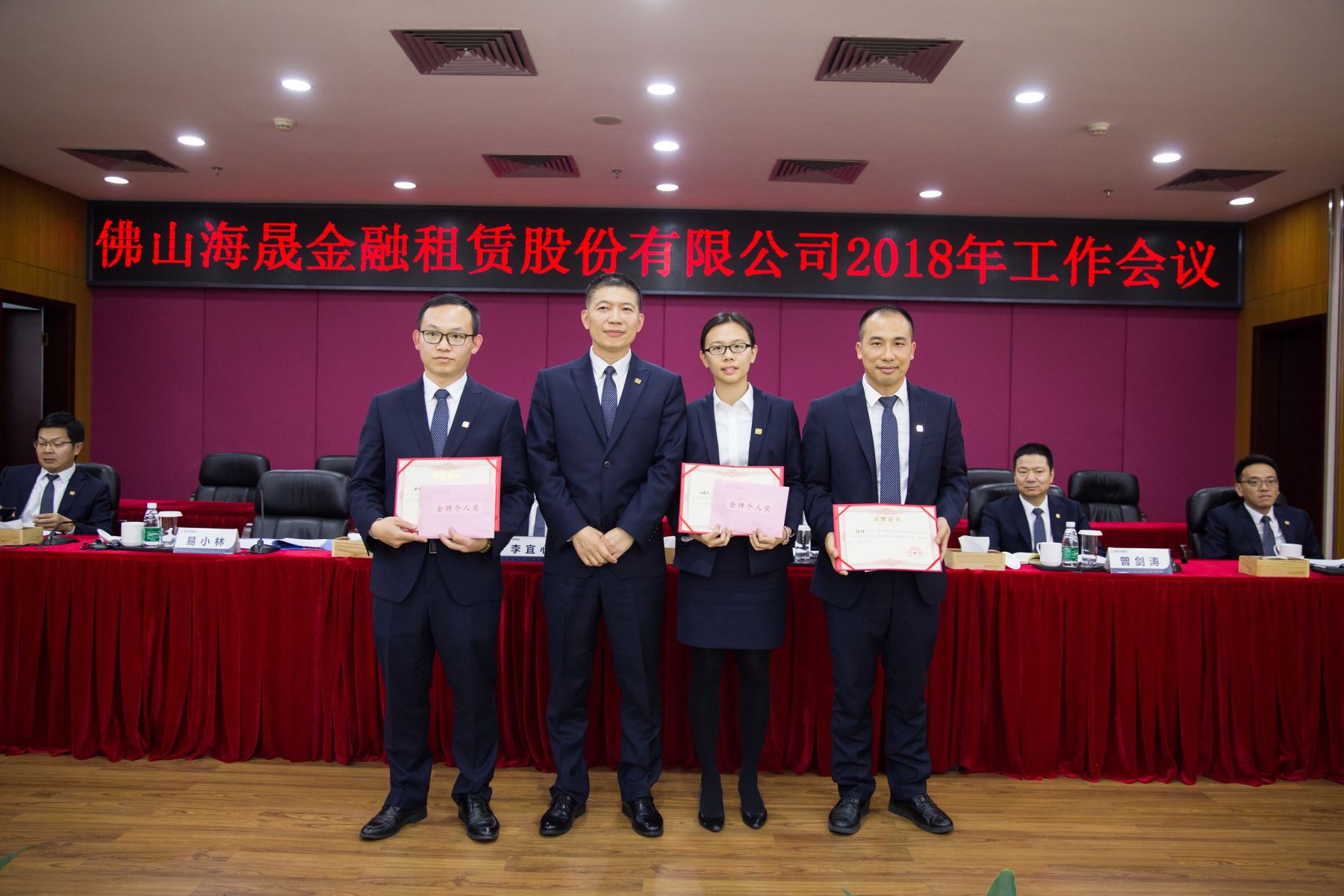 海晟金租副总裁李文胜先生为金牌个人奖获得者张功义、朱华创、李伟东颁奖