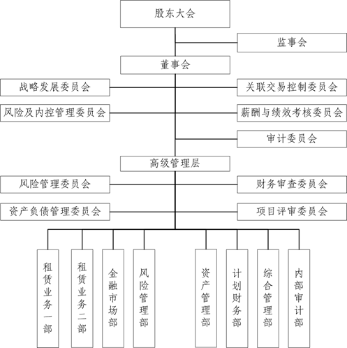 公司坚持以“保证持续发展、保证审慎合规经营、保证在可承受范围内实现风险与收益合理匹配”为原则,建立了分工合理、职责明晰的风险管理组织体系,由董事会、监事会、高级管理层、风险管理部及其他部门组成。董事会对公司的风险管理承担最终责任;董事会下设风险管理委员会,授权其履行部分风险管理职责;监事会负责监督风险管理体系的建立和运行;高级管理层负责风险管理政策的具体实施和执行。公司搭建了风险管理三道防线,租赁业务部门及金融市场部门为第一道防线;风险管理部门、资产管理部门为第二道防线的主要部门;内审部门为第三道防线。