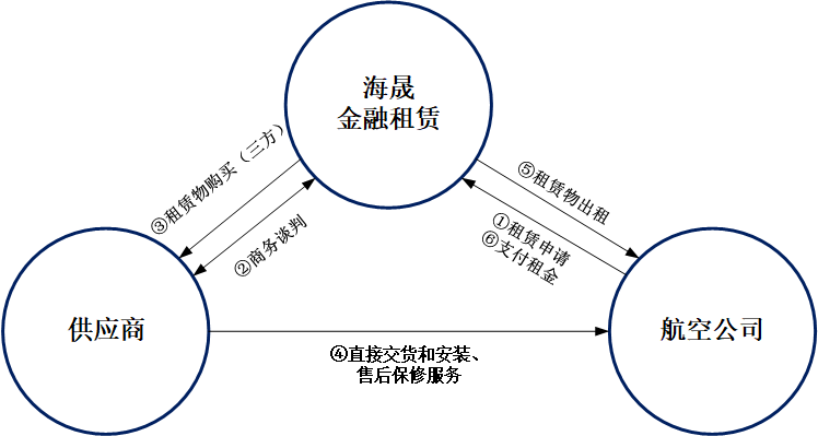 ①直接租赁:由航空公司/航空学校选择飞机和供应商,海晟金租购买选定飞机提供给航空公司/航空学校使用,航空公司/航空学校按期支付租金。租赁期满,航空公司/航空学校以较低名义货价回购飞机。